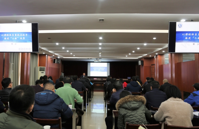 职业教育进入新的发展时期,教师怎么教、教材怎么编、方法怎么变,是摆在职业教育工作者面前的现实问题。针对这些问题,副校长郭沙作《以课程体系重构为抓手 推进“三教”改革》专题报告,阐述了课程体系的内涵、如何科学地构建课程体系,并结合实际指出了我校人才培养方案的优点和需要改进的方面,提出深入推进“三教”改革的基本思路和内容。