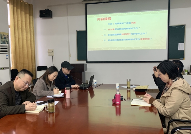 1月11日上午,社会职业与职业发展教育研究院彭振宇教授为外语外贸学院全体教师作《高职院校教师如何进行科研学术工作——以职业教育科学研究为例》专题报告。彭振宇从职业院校教师如何进行科研学术工作为切入点,详细分析课题申报、科学研究、研究报告和学术论文撰写的规范、方法、建议和注意事项。