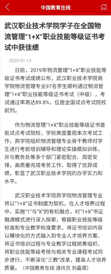 [中国教育在线]武汉职业技术学院学子在全国物流管理“1+X“职业技能等级证书考试中获佳绩