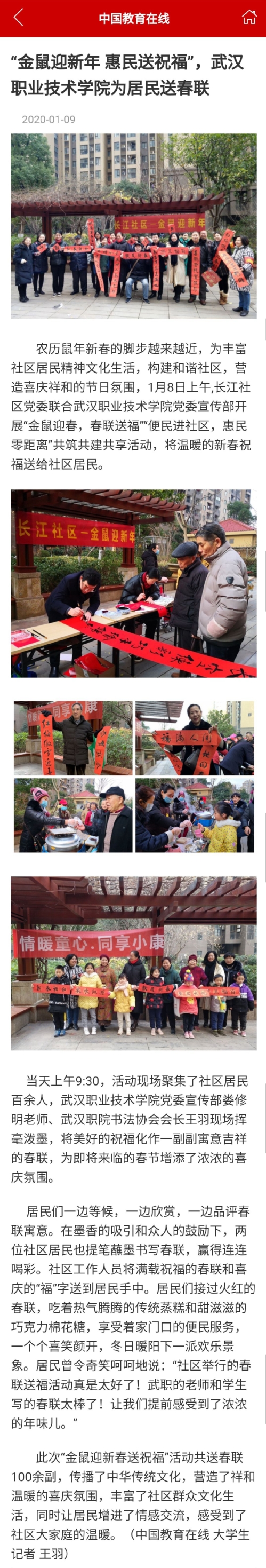 [中国教育在线]“金鼠迎新年 惠民送祝福”,武汉职业技术学院为居民送春联