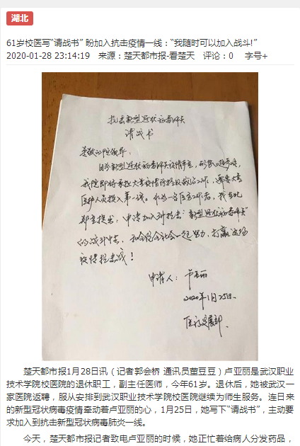 详情请见:61岁校医写“请战书” 盼加入抗击疫情一线:“我随时可以加入战斗!”