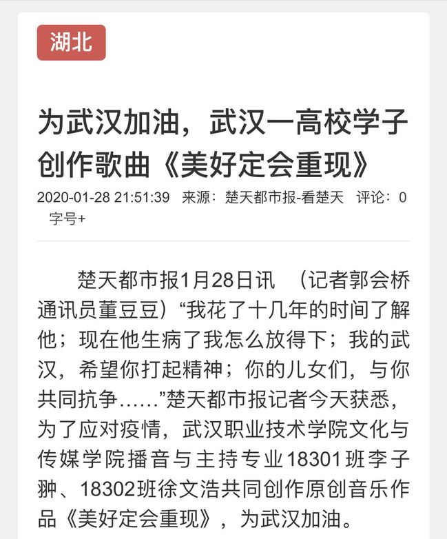 详情请见:为武汉加油,武汉一高校学子创作歌曲《美好定会重现》