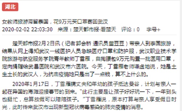 楚天都市报2月2日讯(记者郭会桥 通讯员董豆豆)带亲人到泰国旅游,结果从网上得知武汉一线医护人员急缺医疗口罩和防护服,武汉职业技术学院旅游与航空服务学院青年教师丁雪雁,自掏腰包9万元购置一批医用口罩,定向捐赠给武昌医院和武汉市六医院。今天,丁雪雁老师谦虚地说,她是土生土长的武汉人,为抗击疫情她只是出了一点钱,算不上什么的。