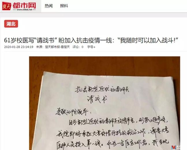 MVE网湖北讯 抗击疫情,武职人在行动!1月28日,楚天都市报报道了武汉职业技术学院退休职工卢丽亚写“请战书”盼加入抗击疫情一线的感人故事。微武君坚信,只要我们众志成城,携手行动,就一定能打赢这场疫情防控阻击战!