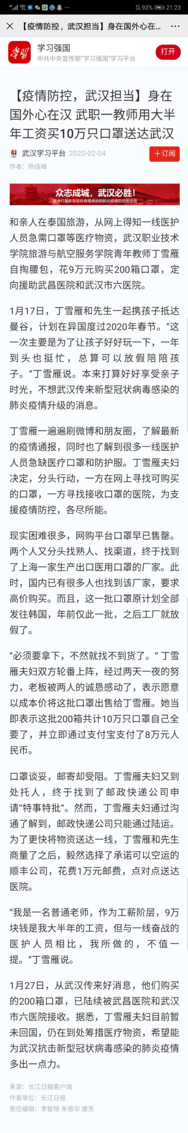 【学习强国】身在国外心在汉 武职一教师用大半年工资买10万只口罩送达武汉