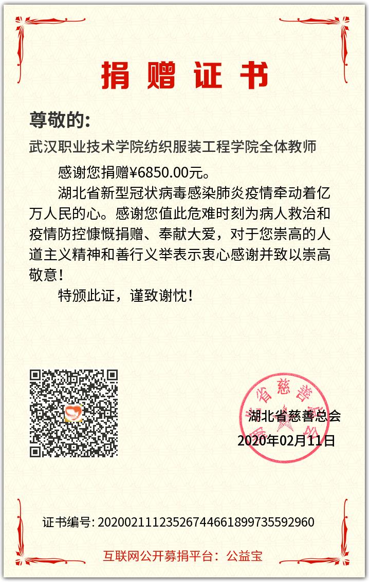 纺织服装工程学院全体教师捐款证书