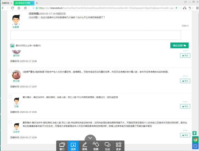 商学院学生对此次大规模线上教学表现出极大兴趣。工管专业朱蔚青老师在《商务数据分析与应用》的在线课堂上,抛出一个关于当下最火热的话题,学生积极参与。“这次疫情中公布的数据有几个指标?为什么不提前公布病死率数据?” 讨论没有正确答案,学生也没有答题的压力。这些话题、视频、图文,成了直播中穿插的一个个“彩蛋”,让课程的脉络更加清晰,也抓住了学生的心。