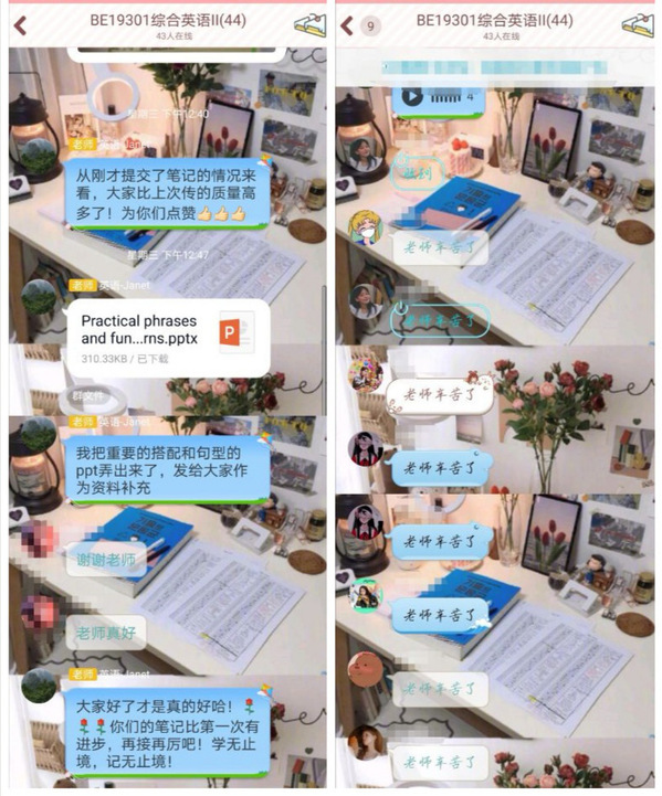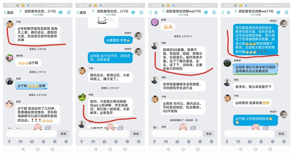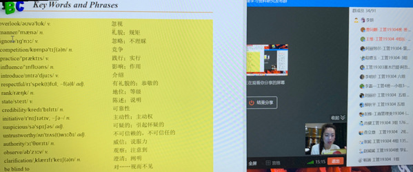 新学期开学来,外语外贸学院以教研室为单位,积极探索“在线课程+”模式授课。基于“智慧职教”、“中国大学MOOC”、超星在线资源等大型教育平台,运用云班课、腾讯课堂、腾讯会议、quizlet、QQ群等多途径“在线课程+”,全面有效地为学生营造良好的学习氛围,保证了教学质量。英专、教研室分享的“云课堂+腾讯会议”组合、宁毅教授分享“优学院+腾讯会议”的教学组合均受到老师们的喜爱;聂钟鸣老师将自己在中国大学mooc建班的经验制作成通俗易懂的指南,普惠教师;刘英老师的学生遇到词汇问题,采用在线演示有道查询,现场解决疑惑,受到学生喜爱。