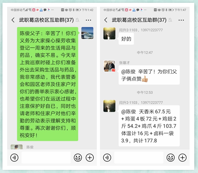 随着管控进一步升级,从2月18日开始,26户教职工和住户又面临生活必需品供应这一新问题。根据葛店开发区新型肺炎防控指挥部要求,园区只能由一名志愿者负责物资、药品采购。了解到26家住户的实际情况,陈俊到园区管委会主动请缨。他向党支部书记周会川说:“我是一名党员,也是一名武职学生,感谢学校和老师的培养。当年在‘创咖吧’学习创业时,老师们的关怀和教导,我一直铭记在心。在这抗疫的特殊时期,能与老师们同舟共济,能为园区的疫情防控尽一点力,为老师和住户们的生活安稳、健康安全做一点事,是自己的荣幸。”在园区互动群内,陈俊向老师和住户们承诺:“我年轻,是本地人,我来为大家服务。请放心,一定把事情办好,让大家满意!”陈俊的热心和细心,深深打动了园区管委会党支部书记的心,也打动了老师和住户们的心。