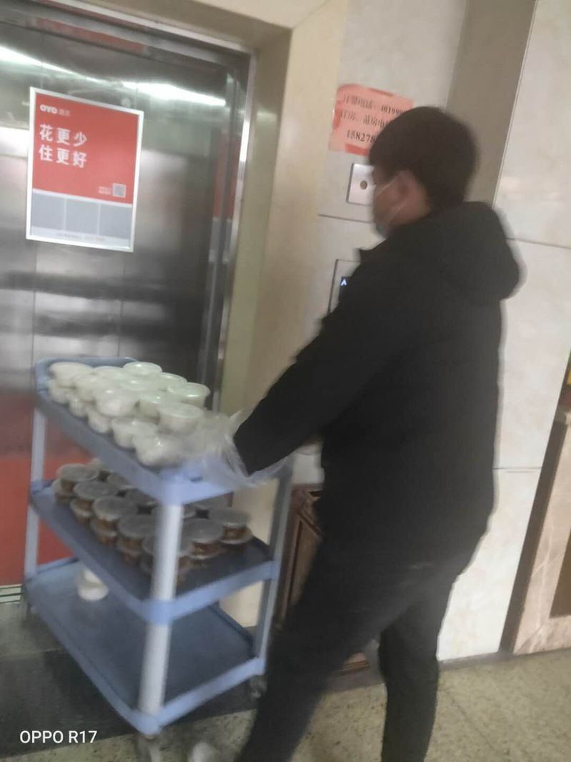 染整17301班黄炎为隔离人员和一线防疫工作者送餐