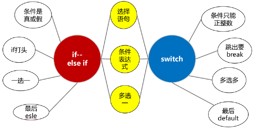 二是在网络授课过程中,改进知识讲解方法。如多用类比尤其是生活化的类比,帮助学生理解概念和程序思想;制作PPT时,多用可视化、结构化、图表等形式吸引学生的注意力,多用案例让学生理解理论的应用。如在讲解if-else if和switch的区别时,陈亭志用到了双气泡图(如图2所示),使两个指令的异同一目了然。