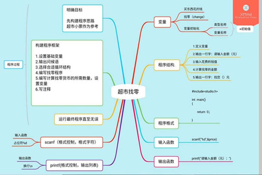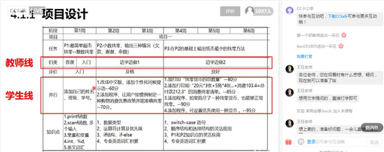 陈亭志将这一整套教学理念和方法应用到本学期的《C语言编程》网络教学中,形成独特的“输入输出式教学”。在输入时,她主要考虑两个方面:一是设计项目化课程,让认知模型和知识点有机结合起来,让学生明晰这些知识点在具体场景中可以解决何种问题,让学生把知识点学活,迁移到不同场景。比如在课程中,她设计的第一个项目是超市找零程序,围绕这个项目分三个任务,难度逐渐增大,并把C语言的知识点融入三个任务(如下图1所示)。二是在项目化教学过程中坚持两条线,即在教师讲授和引导的任务线中,让学生通过学习任务理解知识点,并引入新知识点,实现螺旋上升,难度愈来愈大;在课后学生知识应用的并行线中,学生要根据对应任务对程序进行扩展,不同阶段的任务难度也不同,培养学生用计算机的思路来解决问题和编写程序。此外,按照差异教学原则,在项目设计中对不同层次的学生提出不同的考核要求,并鼓励学生做项目汇报,用视频、PPT等形式展示各自的编程思路,形成作品发在QQ群。越来越多的学生加入项目汇报行列,越来越多的学生用心观摩作品,踊跃交流课程学习感受和心得。