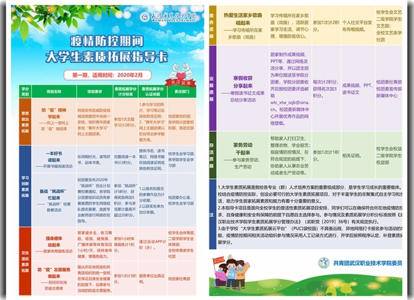 大学生素质拓展作为武汉职院各专业(群)人才培养方案的重要组成部分和学生学习成长的重要载体,在防疫特殊时期也不能停止和断档。2月16日,新学期开学在即,武汉职业技术学院团委大学生素质拓展中心面向全校学生发布了《疫情防控期间的大学生素质拓展指导卡》,第一期指导卡共六个模块,分为“防疫精神学起来、一本好书读起来、备战挑战杯忙起来、强身健体动起来、防疫志愿服务做起来、热爱生活家乡歌曲唱起来、寒假收获分享起来、家务劳动干起来”八项活动课程,引导和鼓励广大学生在确保符合所在地疫情防控要求、自身健康和安全有保障的前提下自主选择参与。学生参与情况将依照《武汉职业技术学院学生素质拓展学分管理办法》,开展过程管理和素质拓展学分认定。