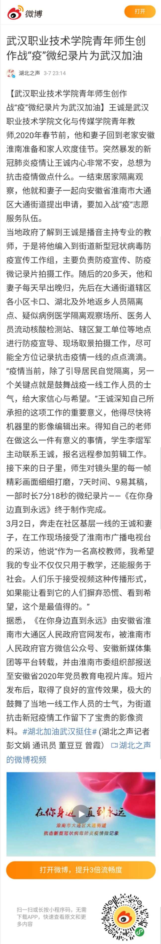 【湖北之声客户端】武汉职业技术学院青年师生创作战“疫”微纪录片为武汉加油