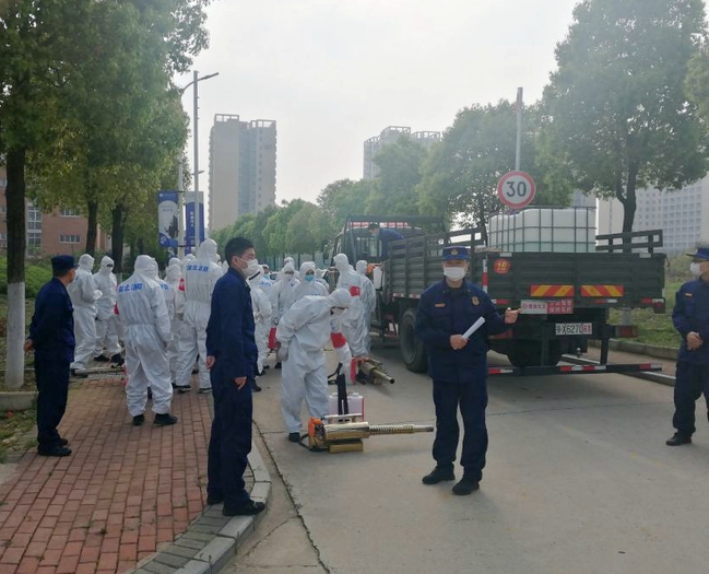 武职网讯(通讯员 王晓青 摄影 张俊鹏)2020年4月4日,安静了许久的科教园区传来阵阵轰鸣声,葛店开发区消防救援大队44名队员同乘4辆作业车走进园区,对学生公寓、教学楼、办公楼、教师公寓楼、学生衣物晾晒场等处实施防疫消杀,为师生返校复课做准备。