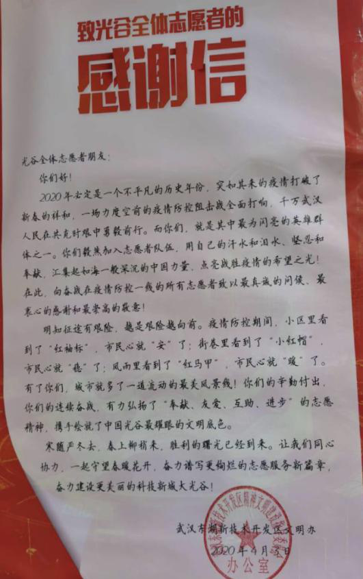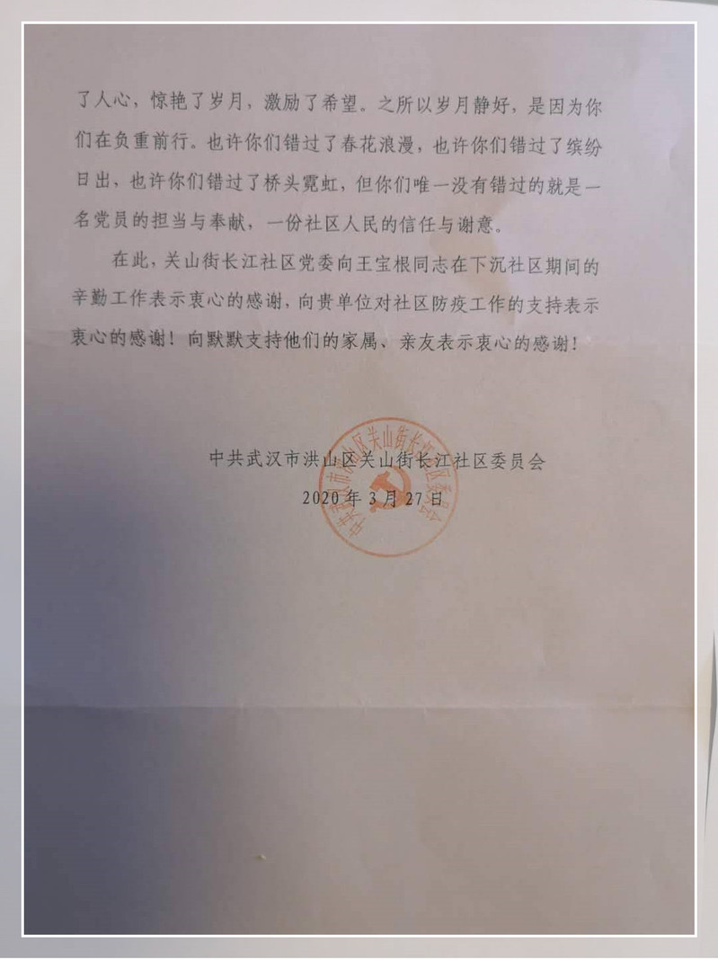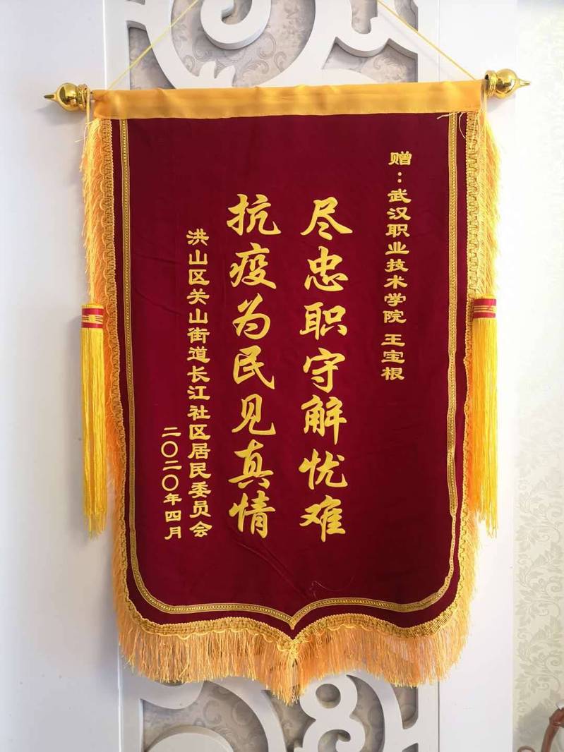 武职网讯(通讯员 严芮)“尽忠职守解忧难,抗疫为民见真情”,4月6日,纺织服装工程学院实训中心主任王宝根收到武汉市洪山区关山街长江社区居委会送来的一面锦旗和一封感谢信。“这是对以王宝根老师为代表的武汉职业技术学院下沉党员在疫情防控期间担当使命、无私奉献的敬意与感激,也是对他不畏艰难、勇挑大梁的高度认可与肯定。”社区代表说。