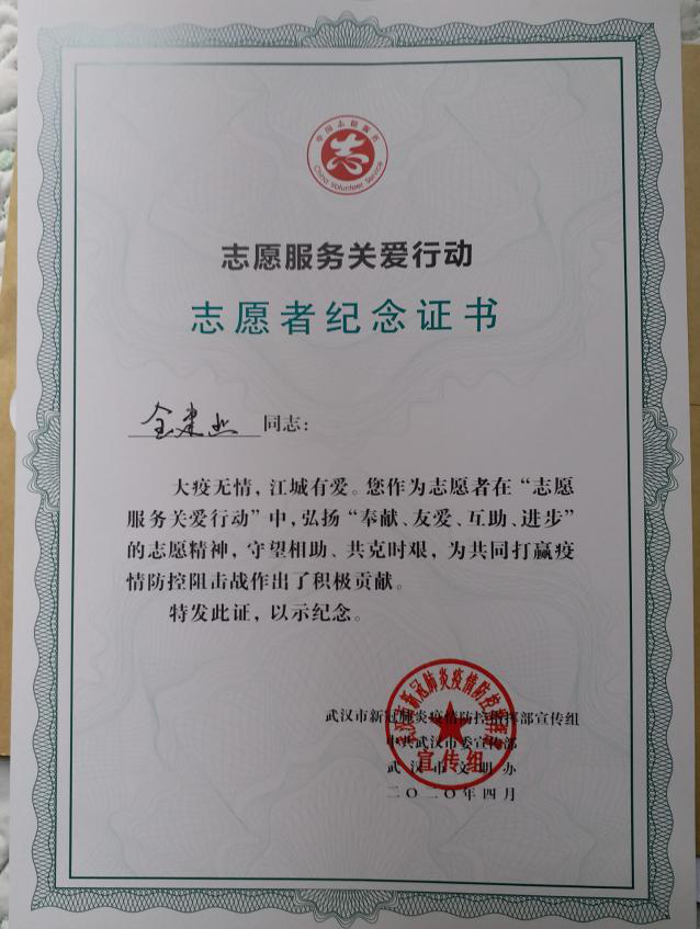 纺织服装工程学院党委副书记全建业参与防疫志愿工作的证书与感谢信
