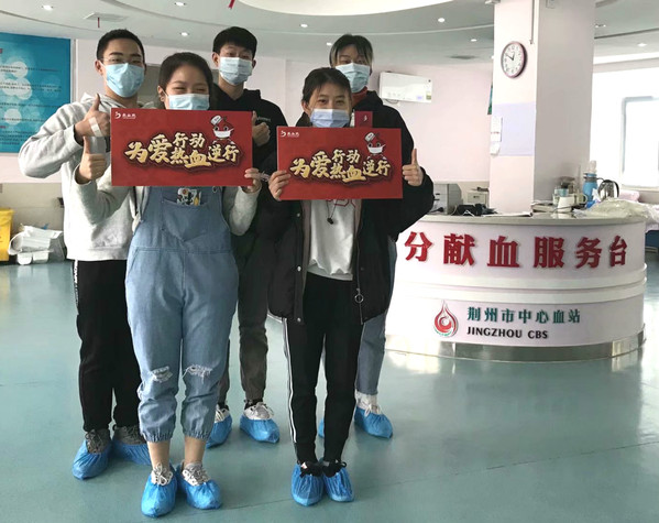 武乐心(后排右一)和高中同学相约到荆州市中心血站献血