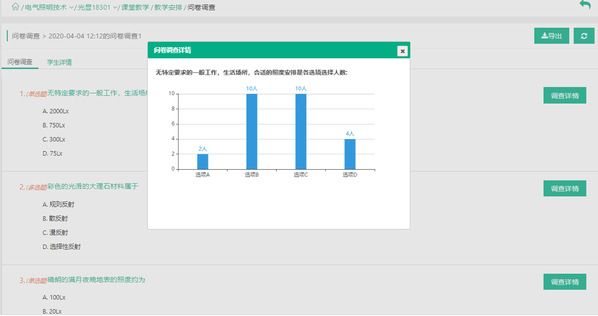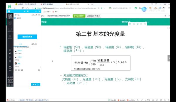 《电气照明技术》专讲教师陈宗能以腾讯课堂直播为主,讲述照明材料的光学性质、光度量的建立及其在照明标准上的应用,全屏分享职教云里面的辅助教学视频。围绕城市道路、城市夜景、建筑照明设计标准等问题,陈宗能在职教云平台上穿插讨论、问卷调查等活动,与学生探讨光度量的应用知识。