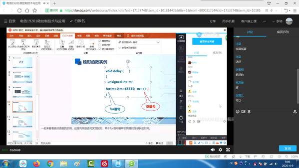 在《微控制技术与应用》课程中,电信教研室教师彭芬利用腾讯课堂平台讲授循环结构for语句。她化繁为简,以常见事例引导学生掌握for语句的特点、格式及应用知识。彭芬重点讲解for语句在延时函数中的应用,指导学生使用for语句编写程序,进行流水灯程序的优化与改造,通过模拟实验引发学生深层次思考。学生在电脑上使用仿真软件绘制原理图,通过发光管左移或右移,可观看流水灯的仿真效果。