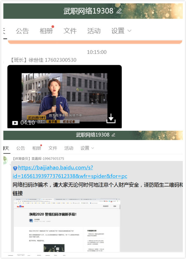 班长徐世佳以“非法网贷的前生今世”为主题,通过相关视频展示,讲解网络时代下各类非法网贷的多重套路和手段,倡导大家要强化个人安全意识,树立正确的消费观;技术小“咖”袁佳辉以“网络诈骗——领取不明消费券”为例,揭露了网络违法犯罪伎俩。他介绍说:“有些不明优惠券的领取地址其实是不法份子设置的钓鱼链接,其目的是为了要获取你的支付数字串,只要用户点击了该链接就会掉入不法份子预先设置的陷阱之中。”袁佳辉还通过技术演示,“复盘”扫描不明二维码、点击不明链接后的操作陷阱。