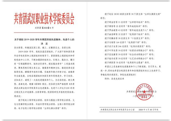 在随后举行的2019-2020学年共青团系统评优表彰大会上,校团委副书记黄晶晶代表校团委作2019-2020学年武汉职业技术学院共青团工作总结报告,宣读《关于表彰2019-2020学年共青团系统先进集体、先进个人的决定》。