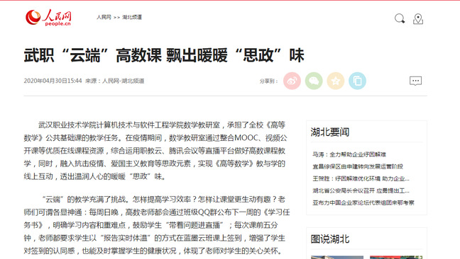 武汉职业技术学院计算机技术与软件工程学院数学教研室,承担了全校《高等数学》公共基础课的教学任务。在疫情期间,数学教研室通过整合MOOC、视频公开课等优质在线课程资源,综合运用职教云、腾讯会议等直播平台做好高数课程教学,同时,融入抗击疫情、爱国主义教育等思政元素,实现《高等数学》教与学的线上互动,透出温润人心的暖暖“思政”味。