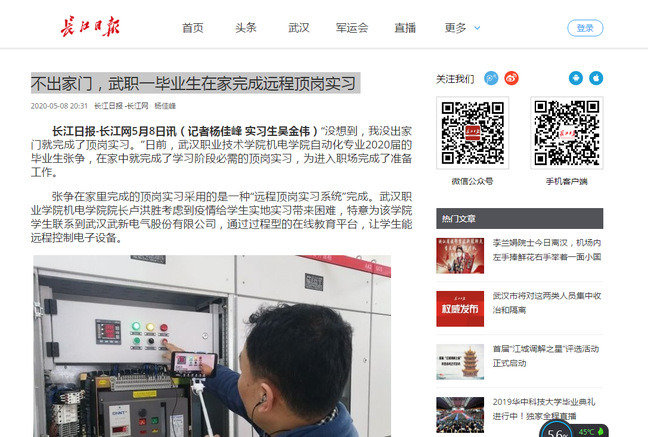 长江日报-长江网5月8日讯(记者杨佳峰 实习生吴金伟)“没想到,我没出家门就完成了顶岗实习。”日前,武汉职业技术学院机电学院自动化专业2020届的毕业生张争,在家中就完成了学习阶段必需的顶岗实习,为进入职场完成了准备工作。