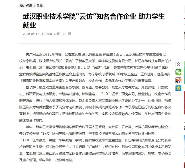 【央广网】武汉职业技术学院“云访”知名合作企业 助力学生就业