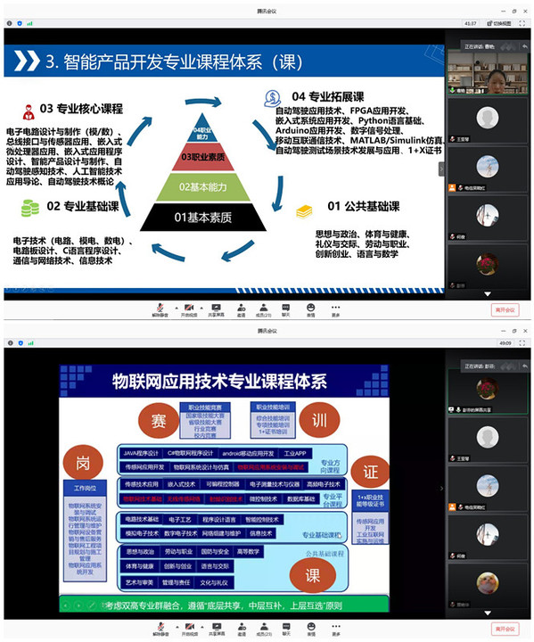 杨雁冰、魏访、曹艳、彭芬、黄艳华、朱里奇等六位专业带头人从企业调研、专业定位、课程设置、实训环境、培养模式等方面依次汇报了对应“芯”“屏”“端”“网”的各专业人才培养方案制定背景及主要内容,并就一系列亟待解决、完善的问题,邀请与会专家“把脉问诊”。