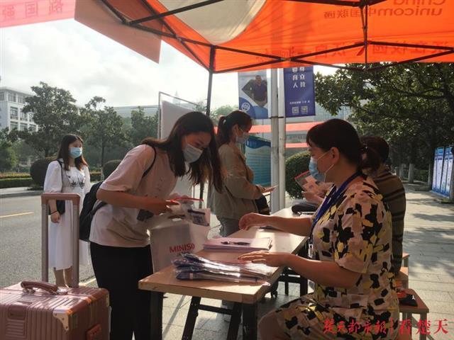 6月26日早晨6:45分,四名来自武汉市内的学生来到校门口。“同学们,欢迎你们返校!”在现场工作人员的引导下,四名学生进入学生专用返校通道,工作人员马上给学生和他们的行李喷洒酒精、消毒。消杀完毕,学生们来到下一个值守点,工作人员查验返校通知书和学生证,确认这四名学生是提前通过预约,接到学校一对一通知当天返校的学生。
