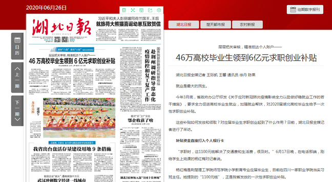 《湖北日报》2020年6月26日 头版头条