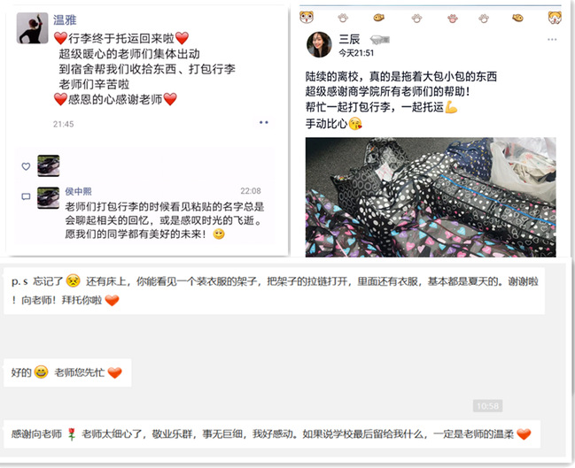 “老师们辛苦了!这些东西我自己收拾都特别累。”“老师您喝口水,休息一下吧!太感谢您了!”看着老师们忙碌的身影,远方的毕业生们倍感亲切。听到学子们一声声真切的感恩话语,看到一次次发来的“比心”以及各式各样的感谢表情包,老师们不再觉得疲惫 ,将三年的师生情谊化作思念与祝福,融入行动中、装进包裹里。