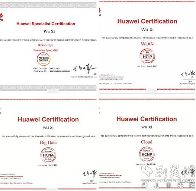 吴茜因其“学霸”人设,早已是计算机技术与软件工程学院小有名气的“网红”。大学期间,她陆续通过华为云计算认证(HCIP-Cloud)、华为无线局域网认证(HCIP-Wlan)、华为数通安全解决方案专家认证(HCS-Solution-IP(security)L2)、华为大数据认证(HCIA-Big Data)。吴茜坦言:“在规划未来时,我总担心学习能力和知识储备不足,想要通过不断学习来提升自己。”出于对知识的渴望与追求,本已顺利进入网络科技公司成为一名售前工程师的她,选择辞去工作专心备考。