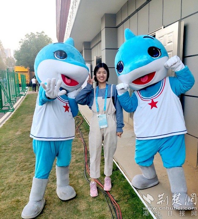 吴茜作为军运会技术支持人员与吉祥物合影。学校供图