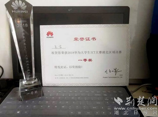 吴茜获得2018年华为大学生ICT大赛湖北赛区决赛一等奖。学校供图