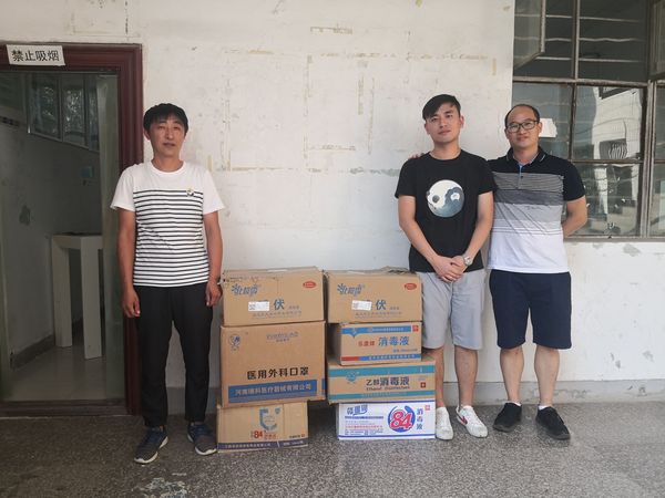 生物工程学院2017届毕业生李国圣(右二)向学校捐赠防疫物资