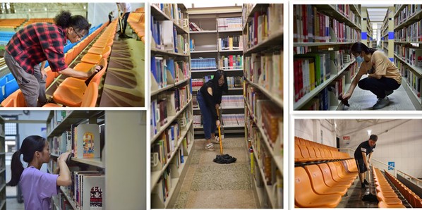 武职网讯(大学生记者 何蝶 彭莹莹 摄影 胡爱妮 张宇轩)9月10日上午,在学校体育馆内、图书馆里一派热闹的场景,有人拖地、有人擦桌椅、有人除尘、有人整理物品……这场景不仅仅是劳动场面,更是软件19305班和应英19303班学生正在进行的劳动实践必修课。
