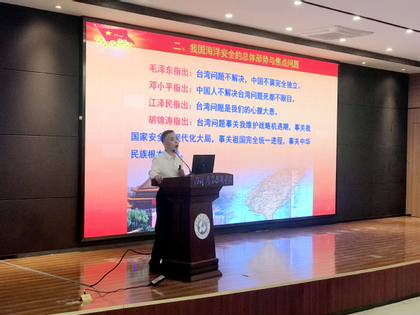 随后,李国新着重分析了我国海洋安全的总体形势与焦点问题。包括我国面临的相对不利的海洋地缘环境和大国封堵战略的客观现实、尖锐复杂的海上争端的现实羁绊、海洋通道不畅的潜在隐患以及台湾问题这个关键“软肋”。在谈到维护海洋安全、建设海洋强国的战略选择这个话题时,李国新从建立健全维护国家海洋安全与权益的领导管理机制、建设21世纪“海上丝绸之路”、采取坚决有效的海上维权行动、大力加强海防力量建设四个方面作了阐述。他指出,封侯非我愿,但愿海波平。面对严峻的海洋形势,我们要深刻领悟习近平总书记关于建设海洋强国、建设“21世纪海上丝绸之路”的重大意义,强化忧患意识,深化海权观念,共同为建设海洋强国、为实现中华民族伟大复兴的中国梦作出应有的贡献。