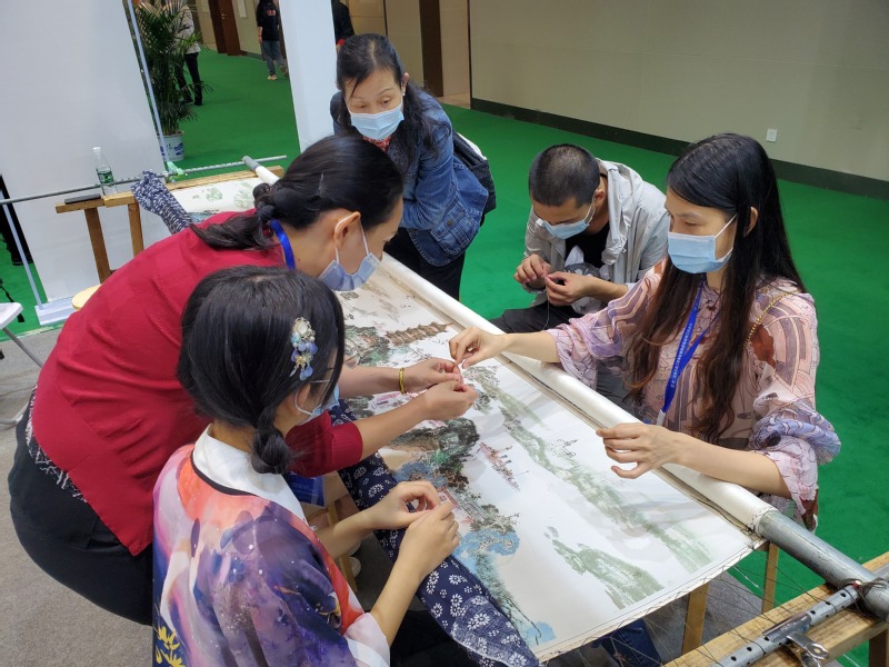 汉绣非遗文化传承人黄春萍大师在现场向前来观摩的嘉宾介绍道:“非物质文化遗产是全人类的共同财富,是一个民族文化与精神的传承,作为中华民族传统文化重要的组成部分,它记录着中华民族生息繁衍的历史,凝结着中华民族的精神,是民族个性、民族审美习惯活的显现。而汉绣作为湖北地区民族精神的传承,承载着荆楚文化的魅力。比如它的用针,有别于四大名绣——苏绣、蜀绣、湘绣和广绣,采用一套铺、平、织、间、压、缆、掺、盘、套、垫、扣的针法,以‘平金夹绣’为主要表现形式,分层破色、层次分明,对比强烈,代表着楚汉人民的风骨。”