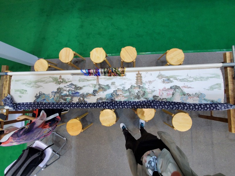在光谷科技会展中心展演现场,十余位身着古典汉裳的武职学子带着虔诚的心,从普通人眼里的“神技”——劈丝开始,绣制长达五米的《锦绣江城》画卷,展示汉绣技艺,表达对大美江城的深深祝福。“劈丝”是刺绣中的精湛技法,可将一根绣花线劈成二份、四份、八份、十六份,并通过双手上下穿梭,绣出层层叠叠深浅明暗。劈丝越细,作品在视觉和手感上越细腻。展示活动中,武职学子牵引“四丝”,巧手翻飞,主要采用黄春萍大师独创的“似绣非画、似画非绣”绘画刺绣结合法绣制《锦绣江城》,将如画如绣的江城美景呈现给观摩者。