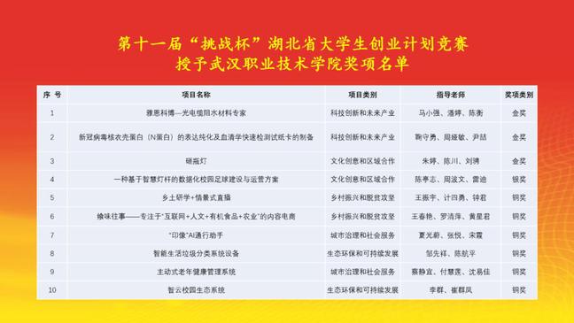 9月25日,第十一届“挑战杯”湖北省大学生创业计划竞赛在湖北工业大学落下帷幕,经过数月鏖战,武汉职业技术学院推荐的参赛作品获得3金1银6铜的优异成绩,首次捧得“挑战杯”,刷新学校参加“挑战杯”大赛以来的记录。