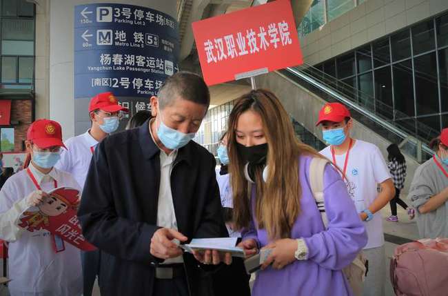 中国青年报客户端讯(董豆豆 侯利华 中青报·中青网记者 朱娟娟)10月10日上午,武汉职业技术学院2020级新生、江苏淮安姑娘冯莹乘坐高铁到达武汉站,她径直来到学校设置在出站口的迎新点,让她惊喜和感动的是,校党委书记、校长李洪渠和志愿者们一起迎了上来,李洪渠校长还为她赠送亲手签名的校园风光明信片,并佩戴校徽。