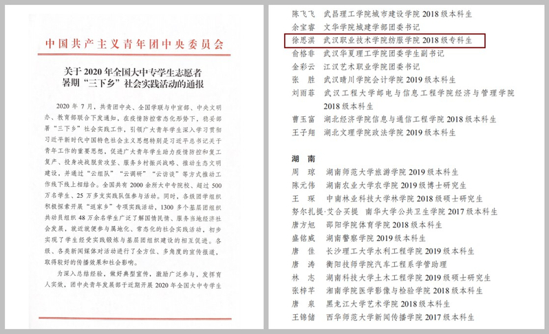 武职网讯(通讯员 罗露 耿小虎)近日,团中央印发《关于2020年全国大中专学生志愿者暑期“三下乡”社会实践活动的通报》,我校纺织与服装工程学院包装18301班学生徐思淇荣获“2020年全国大中专学生志愿者暑期‘三下乡’社会实践活动优秀个人”称号。