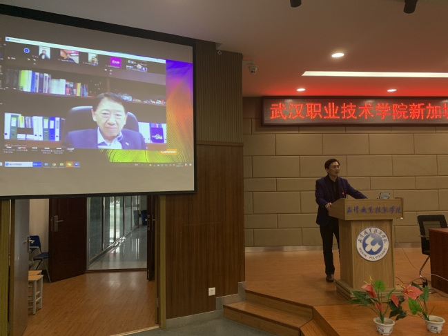 开班仪式上,新加坡东亚管理学院院长Dr. Andrew Chua通过视频会议以一句“Wuhan Well-done!(武汉,太棒了!)”率先致辞,对武汉在全球疫情中的做出的英勇壮举表示由衷的敬佩,对武汉职业技术学院全体师生表达真挚的问候。他讲到,新加坡东亚管理学院与武汉职业技术学院在学术和文化交流上的合作,为促进国际化一流人才培养、推进两国友好往来作出了积极贡献。新加坡东亚管理学院与武汉职业技术学院具有多年的合作基础、广泛的合作前景,双方在全球疫情背景下,仍旧保持了密切的合作关系,也期待在未来能有更深更广的合作。Dr. Andrew Chua对已在新加坡就读本科的武职学子给予高度肯定,同时对国际项目班2020级新生表达了殷切希望和美好祝愿。