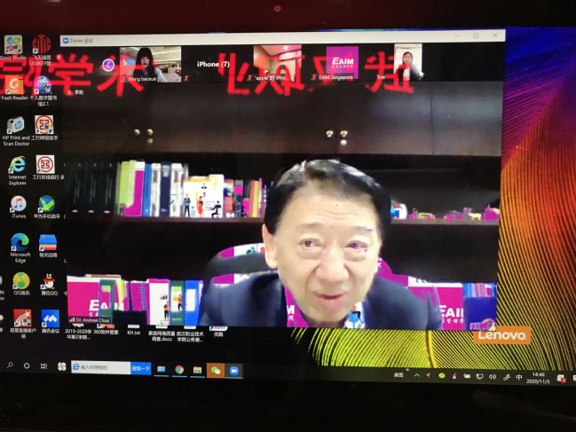 新加坡东亚管理学院院长Dr. Andrew Chua在视频会议上致辞