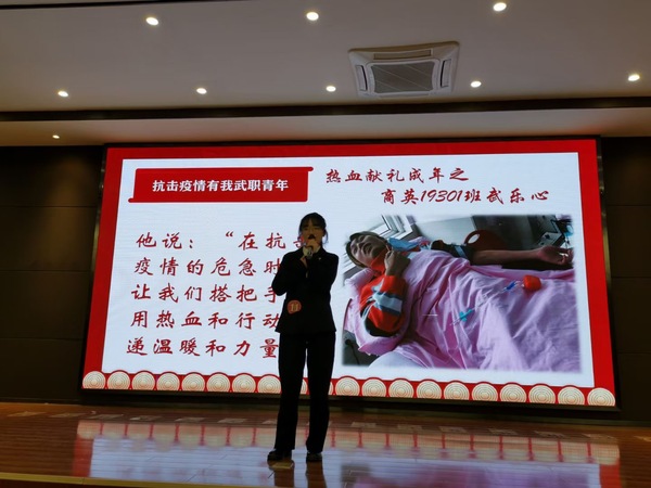 “新时代大学生如何践行工匠精神呢?看,凌家山下,武职学子们在疫情期间闻令而动,关键时刻挺身而出。”在外语外贸学院选手常欢欢饱含深情的演讲中,武职学子鲜活的抗疫形象跃然台上:商英19301班武乐心在抗疫期间用热血传递温暖;机制19304班常国庆在返乡隔离结束时主动站上北风呼啸的抗疫战场;武职学子惠雯毅然加入防疫宣传小分队,每天提醒居民们做好防护措施……“在这场疫情中,武职青年学子用青春力量为家乡排忧解难,用一言一行诠释新时代匠人的精神风骨,用坚守与责任书写了当代青年学子的匠心精神。”常欢欢说。