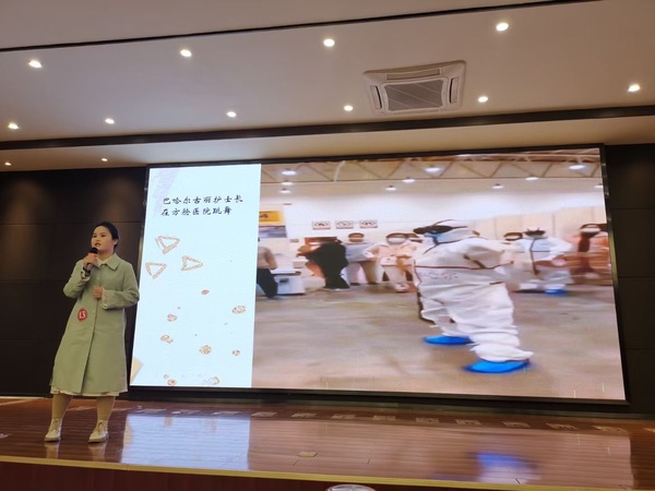 “今年年初,大家有没有看过这样一则视频呢?”建筑工程学院新疆少数民族学生加依达尔•铁勒阿德一上台就以武汉方舱医院护士长巴哈尔古丽的一段哈萨克舞蹈抓住了大家的眼球。紧接着,她讲述了自己疫情期间返校的经历和感受:“从社区志愿者到警察再到医护人员,还有我身边的老师同学们,竭力保护我的生命安全和健康,同时关注着我的心理状态。当困难来临时,每一个人都坚守岗位,肩负责任毫不退缩,我想当今世界,只有我们的祖国能做到这样。”