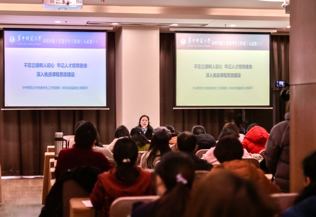 华中师范大学党委学生工作部部长兼本科生院副院长韩君华带来题为《不忘立德树人初心 牢记人才培育使命 深入推进课程思政建设》的主题讲座。她以推进课程思政建设的背景、课程思政要做什么、如何加强课程思政建设为基本框架,抽丝剥茧、层层深入,阐明了课程思政建设的重要性、必要性、迫切性。韩君华提出,课程思政重在观念转变、重在师德风范、重在内容融合,不能单纯为了完成任务而做课程思政,更不能简单照搬思政课的概念,要做到言传身教、润物无声。