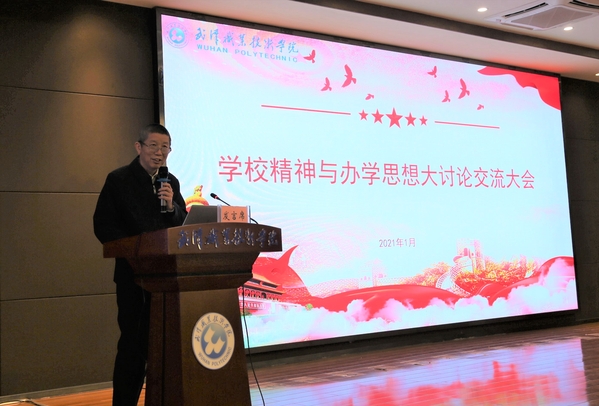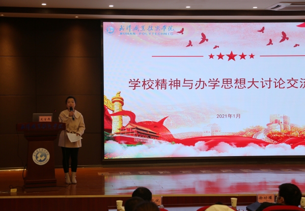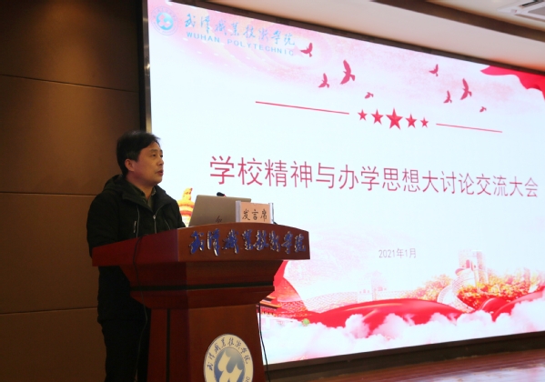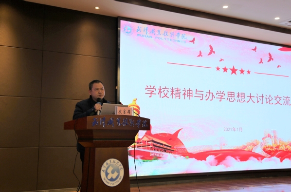 武职网讯(党委宣传部 董豆豆)2021年1月4日,武汉职业技术学院“学校精神与办学思想大讨论交流大会”在凌峰楼C11召开。党委书记、校长李洪渠,党委副书记胡象斌,纪委书记何让波,副校长徐功瑾、李望云、刁元斌出席,学校全体中层干部及教职工代表参加本次大会。大会由党委副书记胡象斌主持。